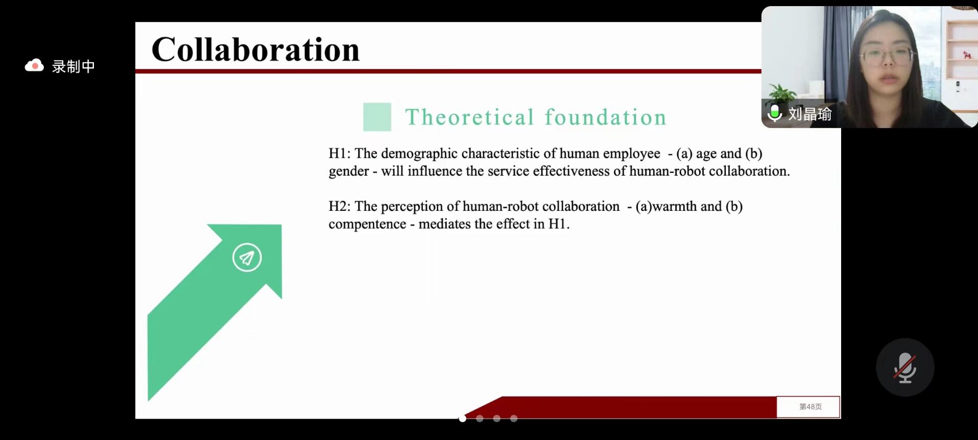 刘晶瑜博士在讲座中,首先向大家引入了劳工替代的假设:H1: Sensing contagion cues positively impacts customers ' adoption of service robots in hospitality service.H2:Customers’social avoidance tendency mediates the effect between sensing contagion cues and adoption of service robots in hospitality service其次,刘晶瑜博士向大家提出了研究问题:Whether and how service robots can influence customers autonomous consumption behavior in hospitality and tourism service encounters?再次,刘晶瑜博士向大家阐释了Social impact theoryIndividuals’ behaviors can be influenced by any real,implied and imagined presence or action of others。最后,刘晶瑜博士强调Theoretical foundation:  Warmth: perceptions of others’ intention, Competence:perceptions of others capabilities。