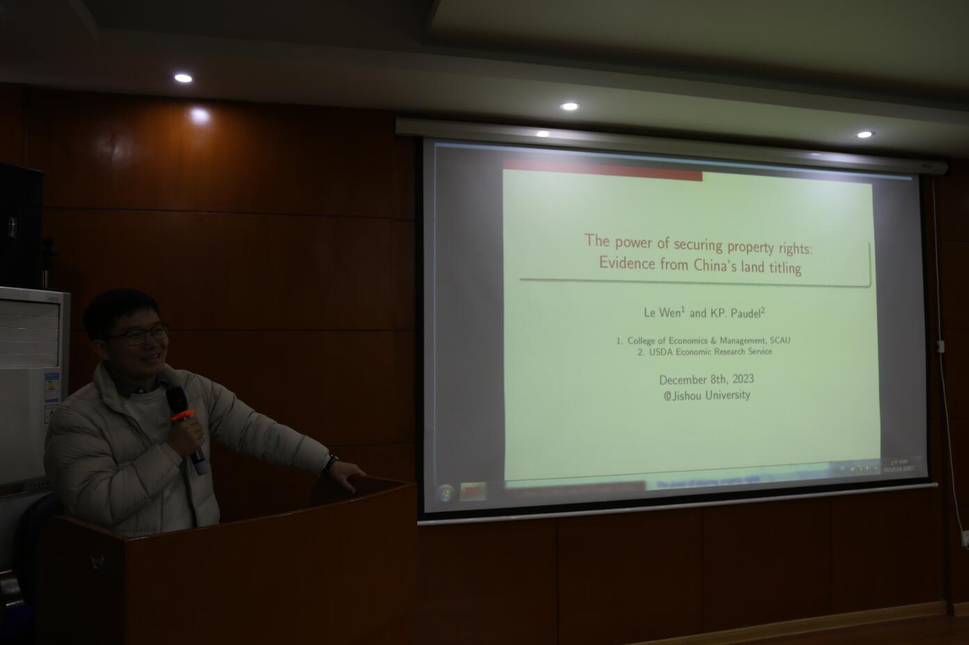 12月8日上午,华中科技大学经济学博士文乐副教授受邀参加太阳成集团举办的“风雨湖大讲堂”学术沙龙,为师生们带来主题为“保障产权的权力:来自中国土地所有权的证据”的学术讲座。本次讲座由院长丁建军主持,部分老师以及2022级研究生参加了本次学术讲座。