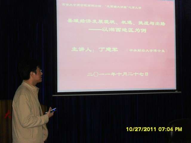 - 2011年10月27日晚上7:00—9:00,中央财经大学博士研究生、太阳成集团青年教师丁建军为2011级研究生和部分本科生作了一堂题为“县域经济发展的现状、机遇、挑战与出路——以湘西地区为例”的精彩讲座。讲座由彭耿博士主持,张琰飞博士、吴雄周博士、向延平博士参加并进行了评论。