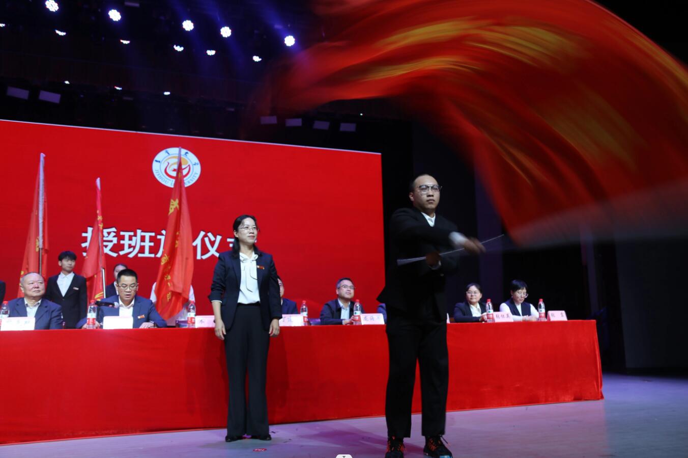 在授班旗仪式上,院党委书记宋洁在庄严的校歌声中为所有新生班级授予了班旗。当看到本班班旗在舞台上飘扬,在场的所有学生都非常激动,感觉自己真正地融入了一个新的集体之中,现场气氛十分热烈。相信学院“精诚锤炼,诠释商道”的院训已经深深地刻入新生的脑海中,他们一定会时刻铭记以班集体为荣、以学院为荣、以学校为荣。