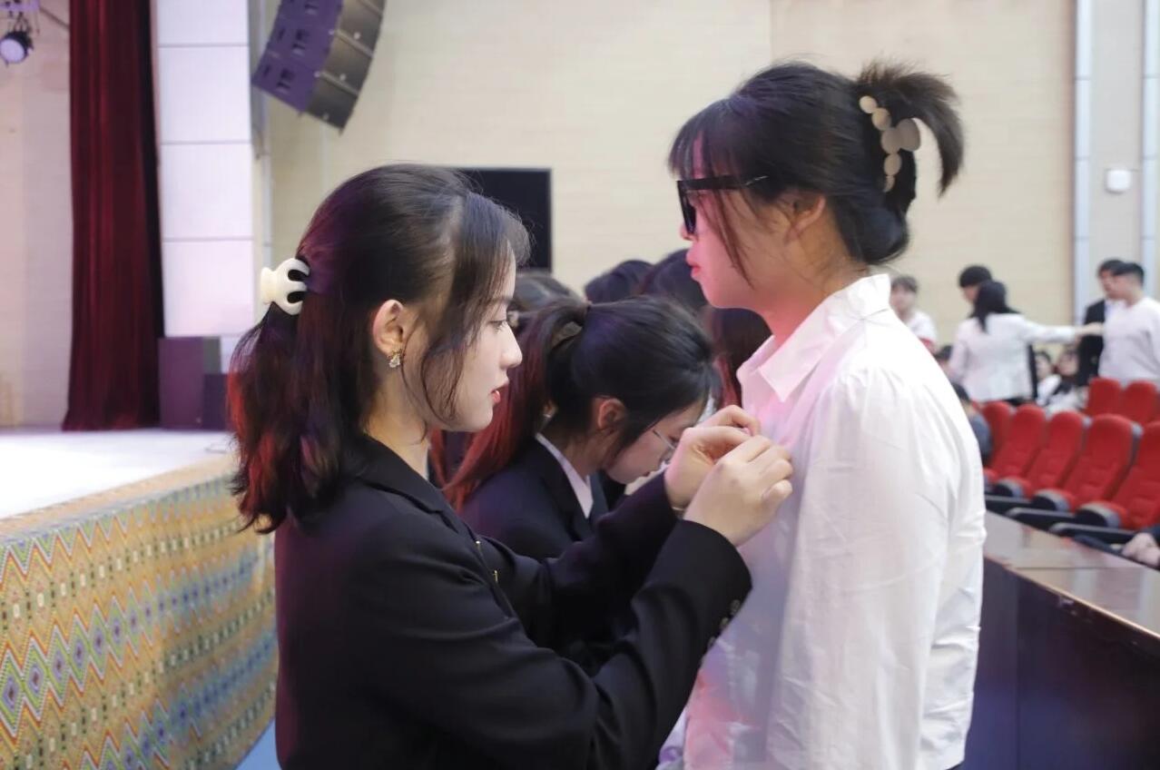 在佩戴校徽仪式上,学院老生代表队伍整齐划一,面带笑容地为2023年入学新生逐一佩戴校徽。 “太阳成集团tyc9728欢迎你”、“希望你们能学有所成”,老生一句句暖心的话语,让新生倍感温暖。校徽在胸,重任在肩,戴上校徽的那一刻,就成为了太阳成集团tyc9728的一员,希望让全体新生秉承“以人名校,以业报国”的校训,传承“凤飞千仞,薪传八方”的精神,争做一名合格的大学生!