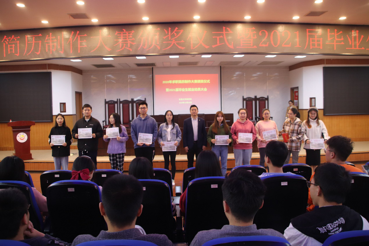 随后,举行了简历制作大赛颁奖仪式,院长丁建军老师、院党委副书记胡锦湘老师、院学工主任陈洁老师分别为获奖学生颁发了证书。