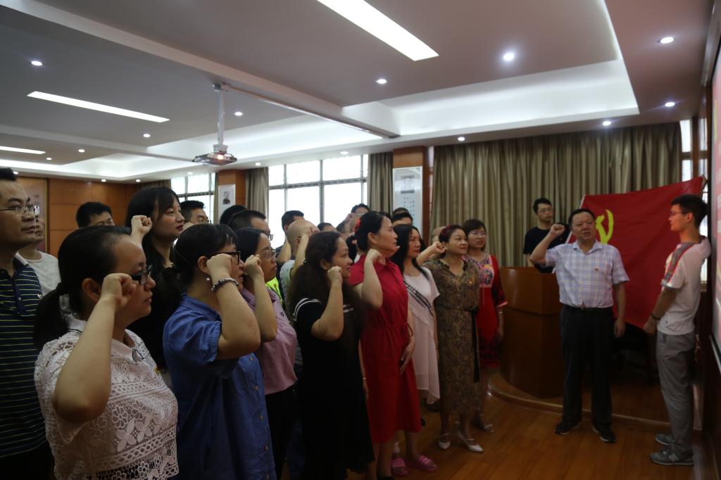 参加主题党日活动的全体党员面向党旗,整齐列队,高举右手,在院党委书记黎克双的领誓下,庄严地重温了入党誓词。