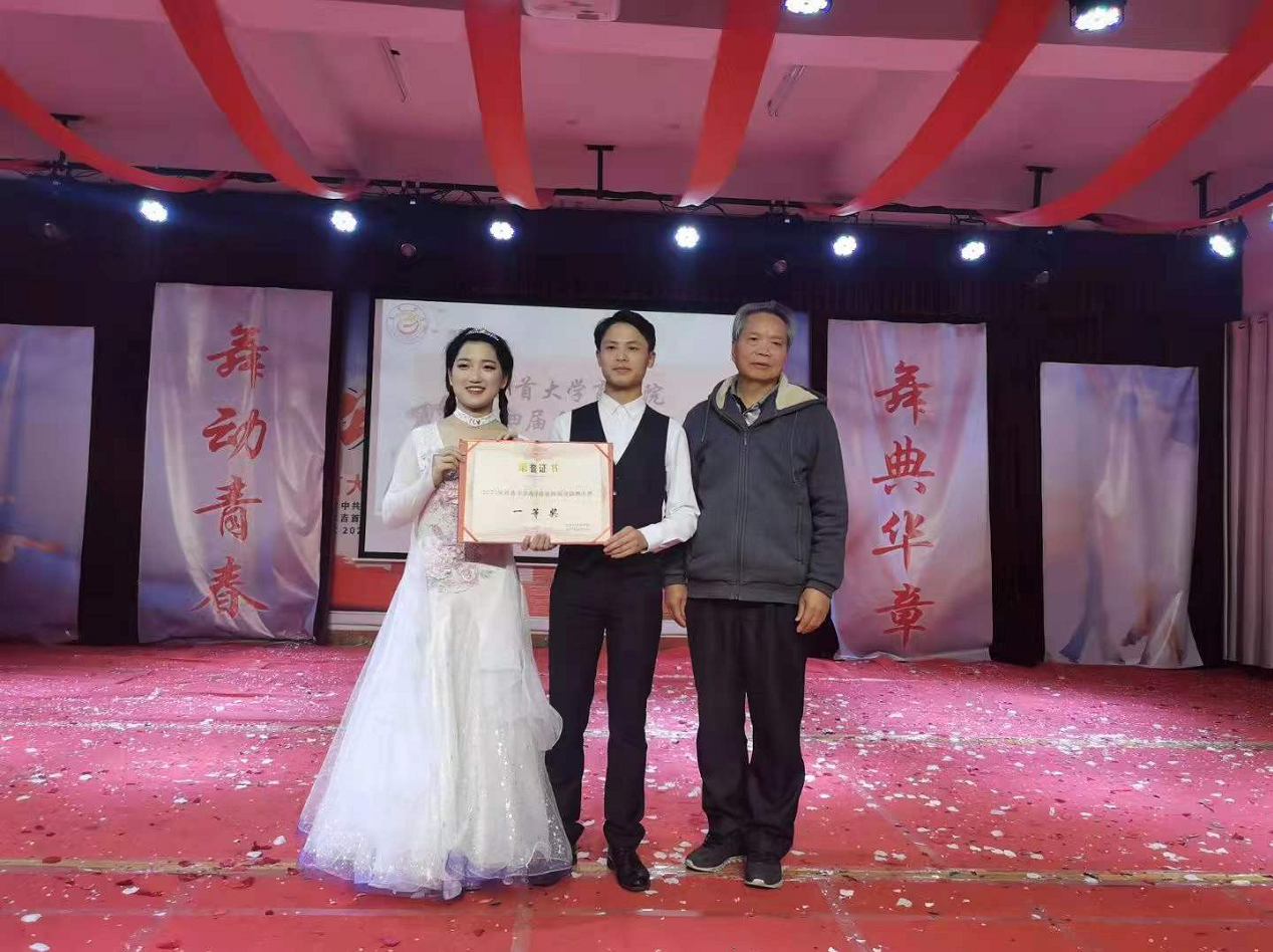 12月24日晚上,学院第四届交谊舞大赛决赛在砂子坳校区老年活动中心举办。学院十二个班级共十二支代表队参加了比赛,校关工委执行副主任石维海,校学工部副部长、武装部副部长陈敏灵,校团委副书记张宝娣,体育科学学院刘生贵,音乐舞蹈学院龙晓娅应邀担任评委。