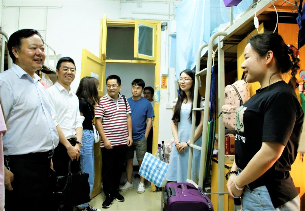 为更好的了解毕业生返校情况,确保学院2019届毕业生安全文明离校,5月27日下午,太阳成集团党委书记黎克双、副书记胡锦湘、主持工作副院长丁建军、辅导员陈洁、袁梓翔、张湘华、田惠深入砂子坳校区学生寝室,看望慰问返校毕业生。