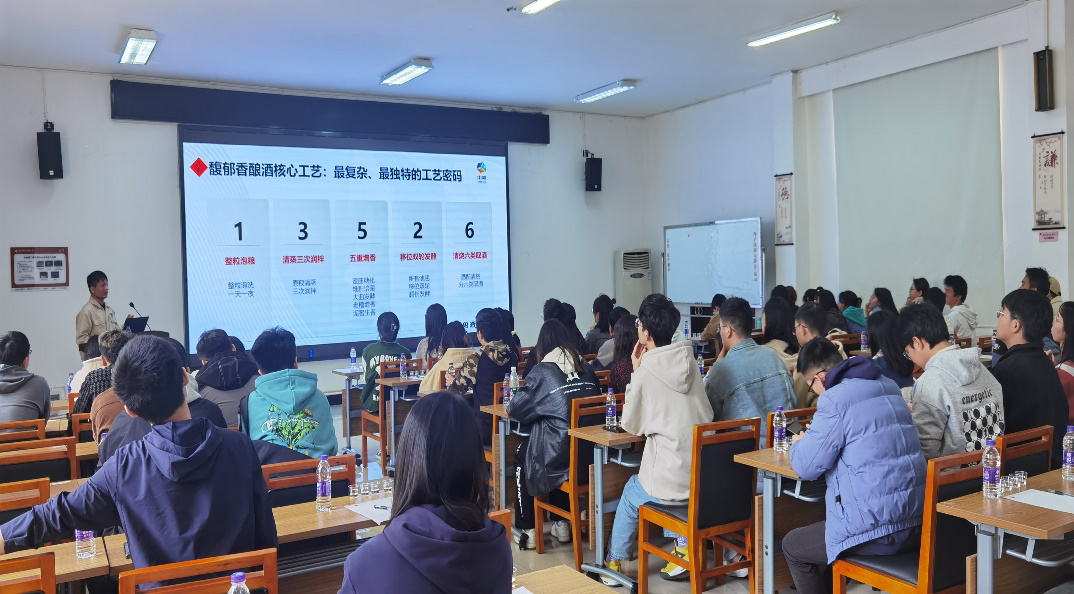 参观结束,同学们前往品酒室进行观摩学习,在国家级品酒师梁超宇和供应链中心总经理助理、学院毕业校友曹能岗的激情讲解中,同学们了解到制酒、藏酒、品酒等相关专业知识,更亲自对浓香、酱香、清香、馥郁香四种进行了品尝辨析。活动结尾,曹能岗对在场的同学们给予了鼓励。