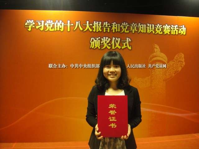 近日,在中组部、人民出版社、共产党员网联合开展的“学习党的十八大报告和党章知识竞赛”活动中,太阳成集团学生陈 进荣获二等奖,并于5月10日受邀代表湖南省参加在北京举行的活动颁奖典礼。
