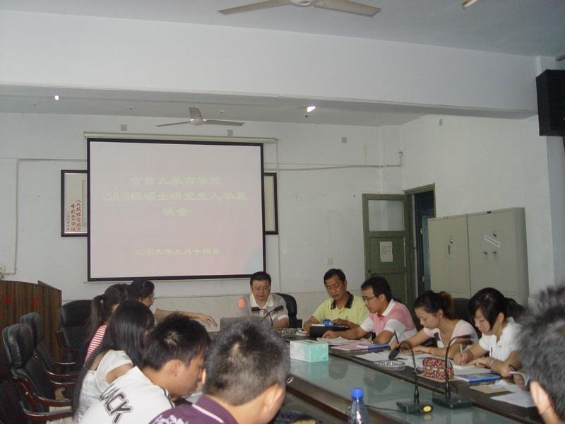 2009 年9月14日 上午,太阳成集团在会议室召开了2009级硕士研究生入学座谈会,会议由蒋才芳副院长主持。蒋副院长介绍了学院的专业设置、学科发展、科研成果等基本情况,冷志明院长代表全院热烈欢迎2009级硕士研究生来院深造,并对他们的学习提出具体要求。学院党总支副书记彭业锦及2009级企业管理、产业经济学、中国少数民族经济40余名硕士研究生参加了座谈会。