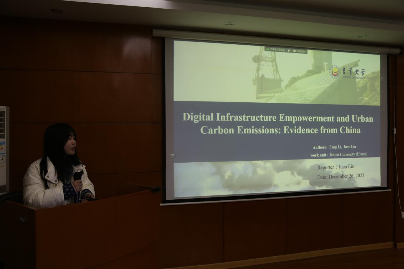 李峰教授团队成员、硕士研究生刘娟以《Digital Infrastructure Empowerment and Urban Carbon Emissions: Evidence from China》为主题做了主旨报告,报告从数字企业、数字个体和数字政府三个角度,用移动基站数据作为数字基础设施的替代变量,研究了数字基础设施对城市碳排放的影响。研究结论表明,城市数字基础设施的发展显著降低了城市碳排放;数字基础设施对城市碳排放的影响是随时间逐渐增加的;数字基础设施推动了企业、个人和政府的数字化来实现对城市碳排放的影响;产业占比高的城市数字基础设施碳减排能力更强,而资源城市中的数字基础设施碳减排效果有限。基于此,研究提出了相应的对策建议。
