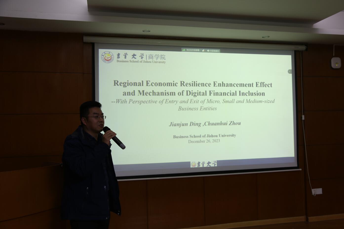 丁建军教授以《Regional Economic Resilience Enhancement Effect and Mechanism of Digital Financial Inclusion:Analysis Based on the Perspective of Entry and Exit of MSME》为主题做了主旨报告,报告基于占市场主体90%的中小微企业进入和退出的视角,构建了基于在位企业主体的经济韧性指数,利用直观和详实数据,并运用双向固定效应模型和中介效应模型探讨了数字普惠金融对区域经济韧性的增强效应及其机制。研究发现:首先,数字普惠金融显著增强了区域经济韧性。即使在使用工具变量解决内生性问题、改变解释变量的计量方法、对抵抗期和恢复期分别进行检验等稳健性检验之后,这一结论仍然成立。此外,与复苏期相比,数字普惠金融对区域经济抗风险能力的提升作用在抵抗期更为明显。其次,异质性分析表明,数字普惠金融对区域经济韧性的促进作用在东部地区和中小城市更强。另外,机制分析表明,数字普惠金融主要通过加强小微创业主体的进入和退出机制,增强区域经济韧性。金融资源的高效配置促进了“优胜劣汰机制”,既保证了现有主体的活力,又通过便利进入和退出促进了产业优化升级,从而增强了区域经济的抗风险能力。