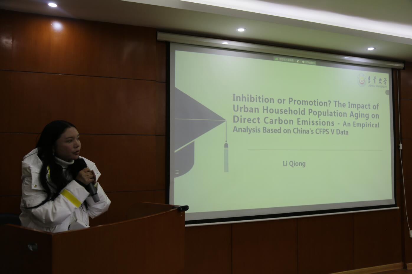 李琼教授以《Inhibition or Promotion? The Impact of Urban Household Population Aging on Direct Carbon Emissions:An Empirical Analysis Based on China's CFPS Data》为主题做了主旨报告,报告从微观视角入手,在基准回归的基础上,利用门槛模型检验了家庭人口老龄化对直接碳排放的非线性关系,并探究了不同人口老龄化阶段下家庭人口老龄化对直接碳排放的影响程度。