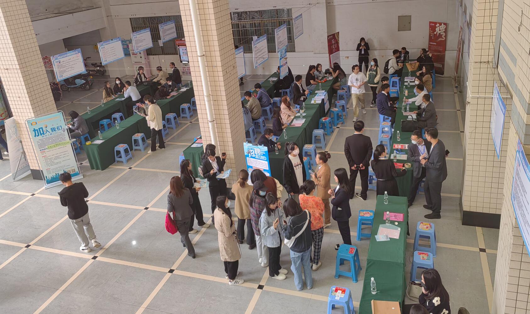 招聘会现场人头涌动,来自证券行业的23家企业与毕业生和肄业生进行了沟通交流。